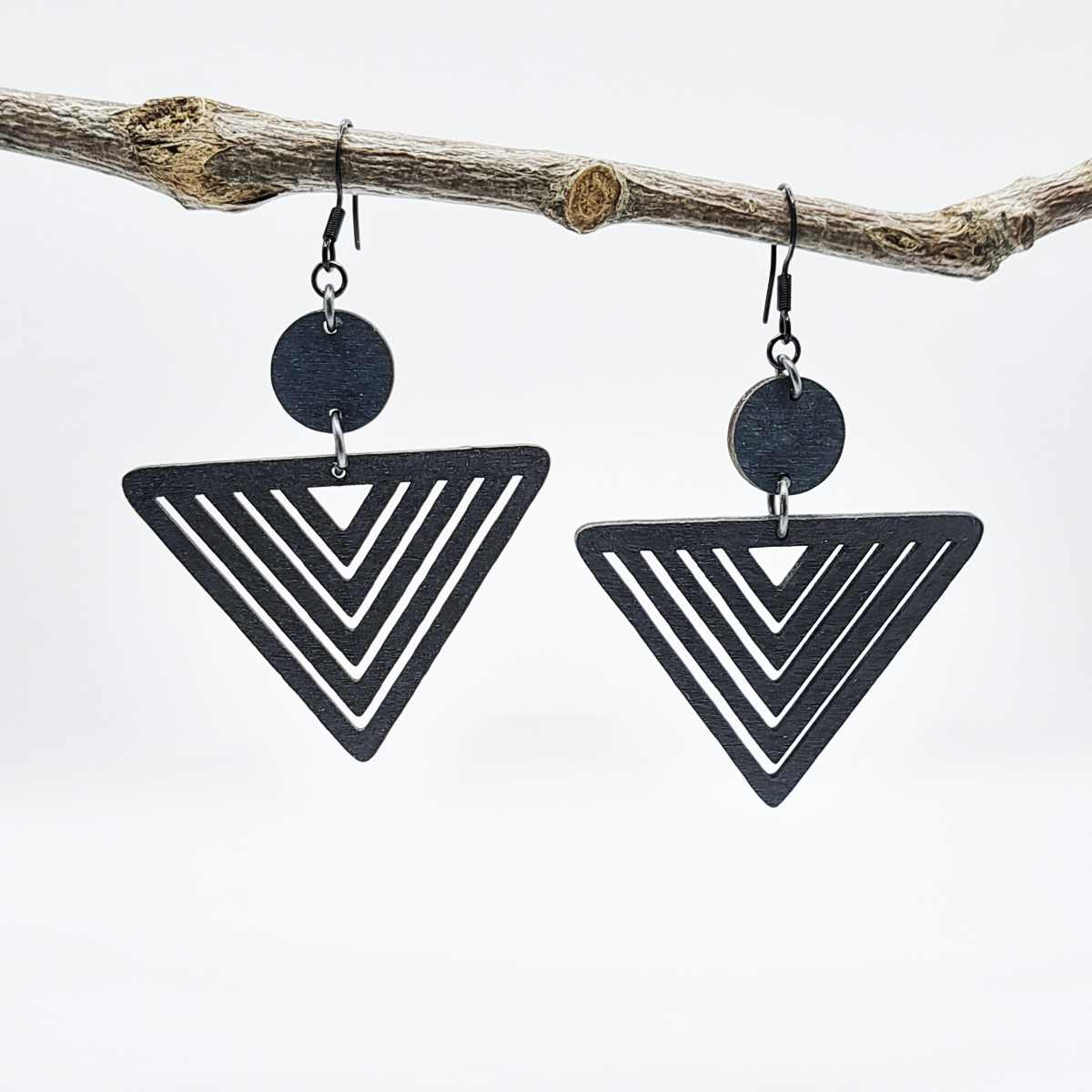 Modernia muotoa luonnonmateriaaleissa. Kevyet, geometriset puukorvakorut yhdistettynä tyylikkäisiin mustiin teräksisiin avokoukkuihin.